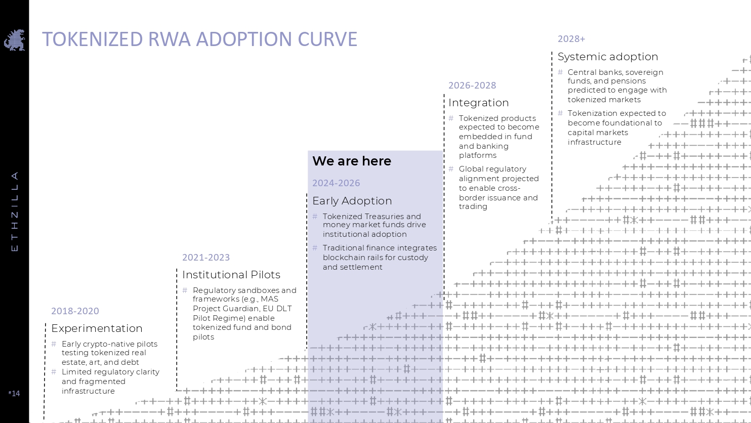 # 14 TOKENIZED RWA ADOPTION CURVE 2018 - 2020 Experimentation # Early crypto - native pilots testing tokenized real estate, art, and debt # Limited regulatory clarity and fragmented infrastructure 2021 - 2023 Institutional Pilots # Regulatory sandboxes and frameworks (e.g., MAS Project Guardian, EU DLT Pilot Regime) enable tokenized fund and bond pilots 2024 - 2026 Early Adoption # Tokenized Treasuries and money market funds drive institutional adoption # Traditional finance integrates blockchain rails for custody and settlement 2026 - 2028 Integration # Tokenized products expected to become embedded in fund and banking platforms # Global regulatory alignment projected to enable cross - border issuance and trading 2028+ Systemic adoption # Central banks, sovereign funds, and pensions predicted to engage with tokenized markets # Tokenization expected to become foundational to capital markets infrastructure We are here