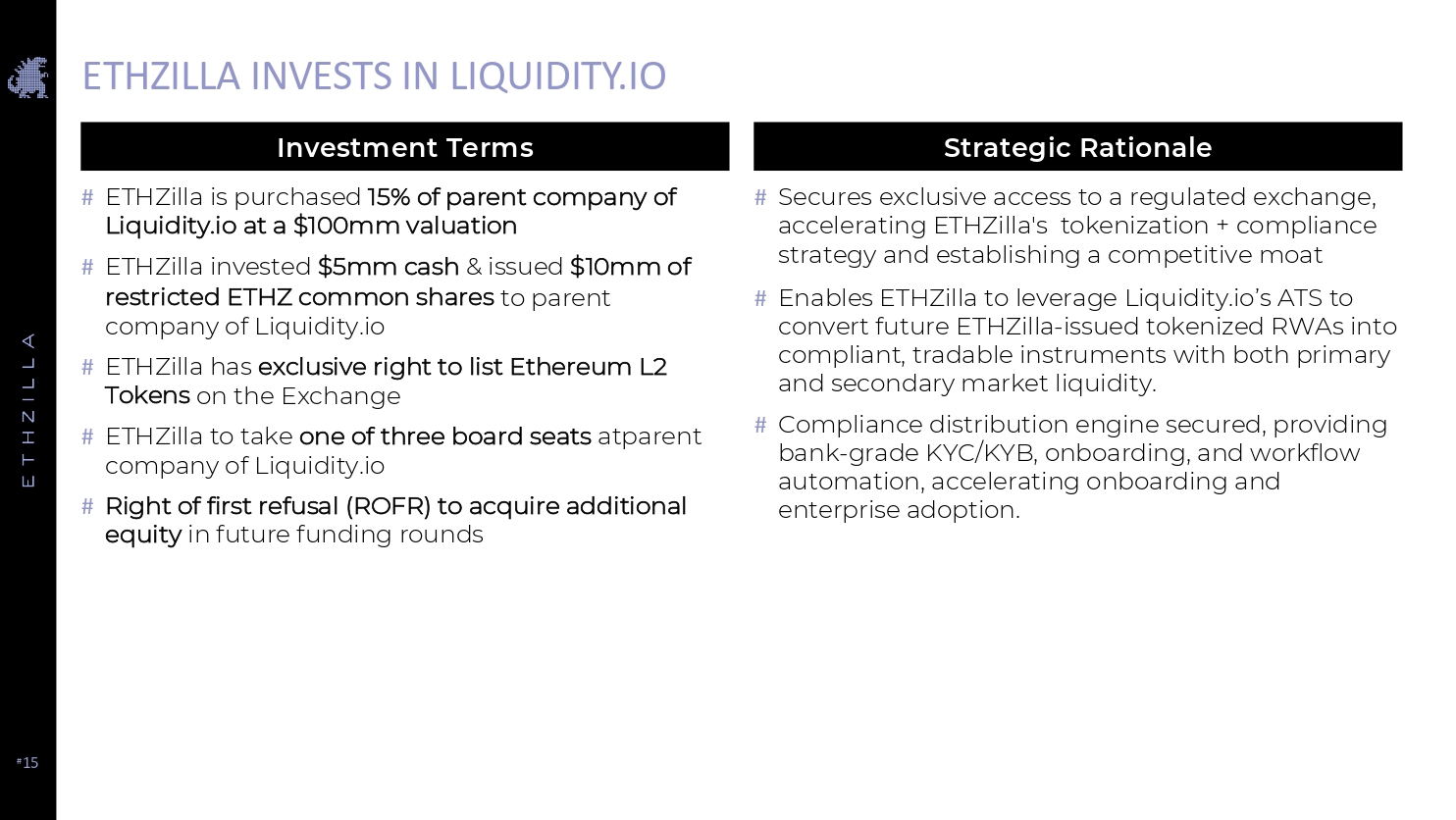 # 15 ETHZILLA INVESTS IN LIQUIDITY.IO # ETHZilla is purchased 15% of parent company of Liquidity.io at a $100mm valuation # ETHZilla invested $5mm cash & issued $10mm of restricted ETHZ common shares to parent company of Liquidity.io # ETHZilla has exclusive right to list Ethereum L2 Tokens on the Exchange # ETHZilla to take one of three board seats atparent company of Liquidity.io # Right of first refusal (ROFR) to acquire additional equity in future funding rounds Investment Terms Strategic Rationale # Secures exclusive access to a regulated exchange, accelerating ETHZilla's tokenization + compliance strategy and establishing a competitive moat # Enables ETHZilla to leverage Liquidity.io’s ATS to convert future ETHZilla - issued tokenized RWAs into compliant, tradable instruments with both primary and secondary market liquidity. # Compliance distribution engine secured, providing bank - grade KYC/KYB, onboarding, and workflow automation, accelerating onboarding and enterprise adoption.