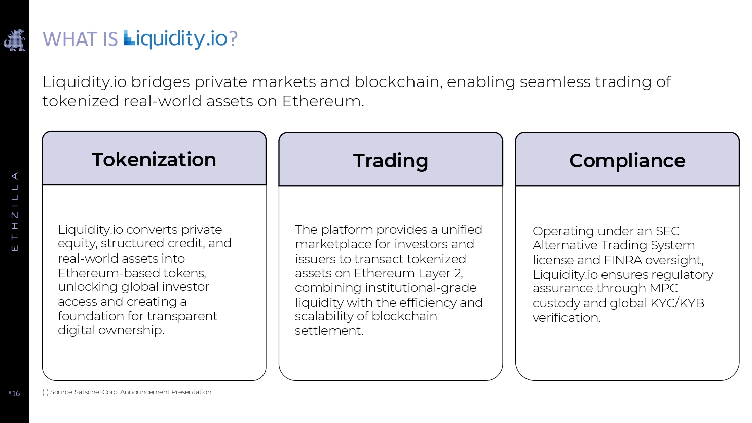 # 16 WHAT IS ? Liquidity.io bridges private markets and blockchain, enabling seamless trading of tokenized real - world assets on Ethereum. (1) Source: Satschel Corp. Announcement Presentation Liquidity.io converts private equity, structured credit, and real - world assets into Ethereum - based tokens, unlocking global investor access and creating a foundation for transparent digital ownership. Tokenization The platform provides a unified marketplace for investors and issuers to transact tokenized assets on Ethereum Layer 2, combining institutional - grade liquidity with the efficiency and scalability of blockchain settlement. Trading Operating under an SEC Alternative Trading System license and FINRA oversight, Liquidity.io ensures regulatory assurance through MPC custody and global KYC/KYB verification. Compliance