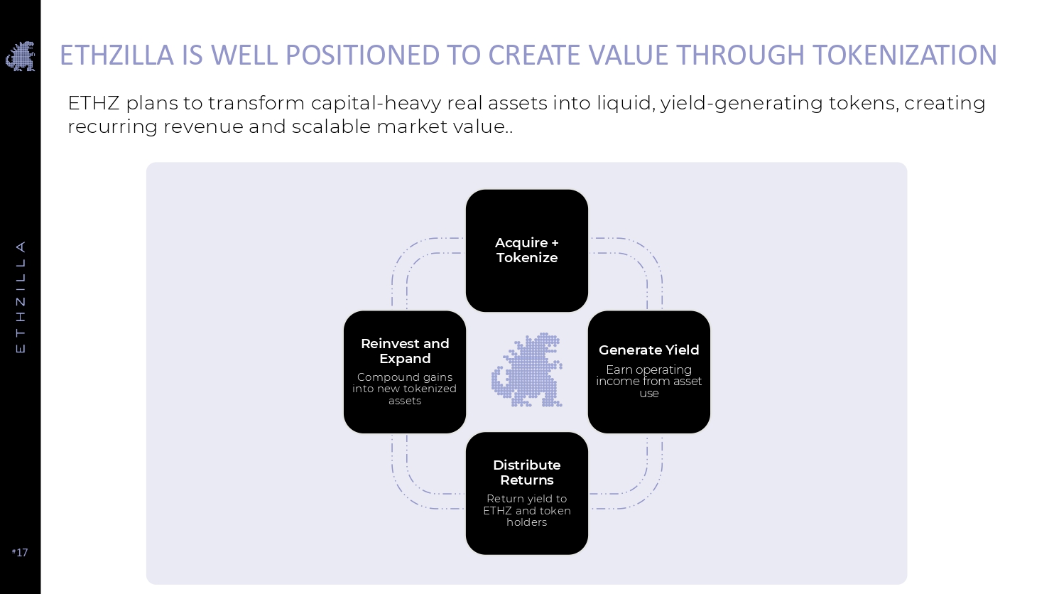 # 17 ETHZ plans to transform capital - heavy real assets into liquid, yield - generating tokens, creating recurring revenue and scalable market value.. ETHZILLA IS WELL POSITIONED TO CREATE VALUE THROUGH TOKENIZATION Acquire + Tokenize Distribute Returns Return yield to ETHZ and token holders Generate Yield Earn operating income from asset use Reinvest and Expand Compound gains into new tokenized assets