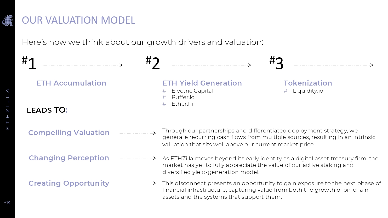 # 19 # 3 OUR VALUATION MODEL # 1 ETH Accumulation ETH Yield Generation # Electric Capital # Puffer.io # Ether.Fi Tokenization # Liquidity.io LEADS TO : Here’s how we think about our growth drivers and valuation: Through our partnerships and differentiated deployment strategy, we generate recurring cash flows from multiple sources, resulting in an intrinsic valuation that sits well above our current market price. As ETHZilla moves beyond its early identity as a digital asset treasury firm, the market has yet to fully appreciate the value of our active staking and diversified yield - generation model. This disconnect presents an opportunity to gain exposure to the next phase of financial infrastructure, capturing value from both the growth of on - chain assets and the systems that support them. Compelling Valuation Changing Perception Creating Opportunity # 2