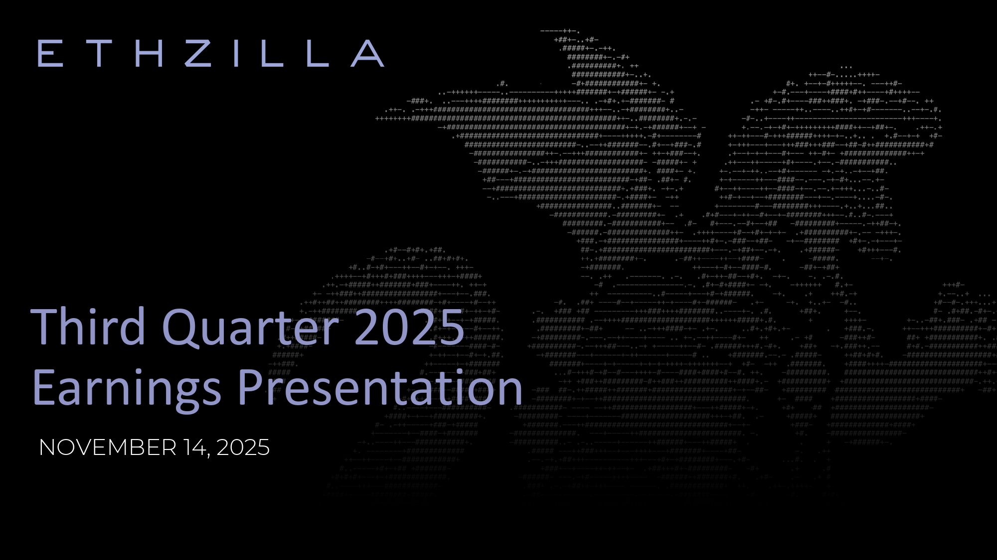 This presentation has been prepared by ETHZilla Corporation (“ETHZilla” or the “Company”) solely for information purposes. The Company is making this presentation available in connection with an update on its business operations and strategies. This presentation does not contain all relevant information relating to the Company or its securities, particularly with respect to the risks and special considerations involved with an investment in the securities of the Company. Certain information contained in this presentation was obtained from various sources, including third parties, none of which has been commissioned and certain of which have not been independently verified. No representation, warranty or undertaking, express or implied, is made as to, and no reliance should be placed on, the fairness, accuracy, completeness, correctness or reasonableness of the information or the sources presented or contained herein. Unless otherwise set forth herein, this presentation speaks as of November 14, 2025. The information presented or contained in this presentation is subject to change without notice. Neither the delivery of this presentation nor any further discussions of the Company or any of its affiliates, shareholders, controlling persons, directors, officers, employees, agents, advisors or representatives with any of the recipients shall, under any circumstances, create any implication that there has been no change in the affairs of the Company since that date. This presentation contains statements that constitute forward - looking statements within the meaning of the Private Securities Litigation Reform Act of 1995 and other applicable securities laws. All statements other than statements of historical fact are forward - looking statements. These statements can be recognized by the use of words such as “believe,” “expect,” “anticipate,” “potential,” “create,” “intend,” “could,” “should,” “would,” “may,” “plan,” “seek”, “will,” “look,” “future,” “assume,” “continue,” or the negative of such terms or other variations thereof, or words of similar substance or meaning. Such forward - looking statements are not guarantees of future performance and involve risks and uncertainties, and actual results may differ from those in the forward - looking statements as a result of various factors and assumptions, that could cause actual results to differ materially from those contained in any forward - looking statement and which are inherently subject to significant uncertainties and contingencies that are or may be difficult or impossible to predict and are or may be beyond our control. The Company and its affiliates, shareholders, controlling persons, directors, officers, employees, agents, advisors and representatives assume no obligation to and do not undertake to update such forward - looking statements to reflect future events or circumstances, except as required by law. ETHZilla’s business is subject to substantial risks and uncertainties, including, among others: the possibility that proposed transactions may not be completed; failure to achieve anticipated benefits from stock repurchases, private placements, convertible notes, or digital asset strategies; fluctuations in ETH and other cryptocurrency prices affecting financial reporting; regulatory and legal uncertainties relating to cryptocurrencies, risks associated with outstanding debt, including convertible notes and OTC facilities; potential dilution from future financings or ATM offerings; operational and competitive risks; potential litigation; geopolitical, economic, and market conditions; and tax and accounting uncertainties, including GAAP fair value adjustments and potential impairment charges on crypto assets. Investors are cautioned not to place undue reliance on forward - looking statements. For a more complete discussion, see the “Forward - Looking Statements,” “Risk Factors” and “Management’s Discussion and Analysis of Financial Condition and Results of Operations” sections of the Company’s Form 10 - K for the year ended December 31, 2024, Form 10 - Q for the quarter ended September 30, 2025, and other SEC filings, including future Form 10 - Qs, Form 10 - Ks and Form 8 - Ks, all of which are filed with the SEC and available at www.sec.gov . All trademarks, service marks, and trade names of any party of their respective affiliates used herein are trademarks, service marks, or registered trade names of such party or its respective affiliate, respectively, as noted herein. Any other product, company names, or logos mentioned herein agree the trademark and/or intellectual property of their respective owners, and their use is not alone intended to, and does not alone imply, a relationship with any party, or an endorsement or sponsorship by or of any party. Solely for convenience, the trademarks, service marks and trade names referred to in this presentation may appear without the ®, TM or SM symbols, but such references are not intended to indicate, in any way, that any party of the applicable rights owner will not assert, to the fullest extent under applicable law, their rights or the right of the applicable owner or licensor to these trademarks, service marks and trade names. Actual results may vary greatly from any assumptions or models built in reliance on this presentation. Results may vary due to market conditions, unforeseen circumstances, competition, an unforeseen change in how regulators in the USA or elsewhere categorize ETH, and results are subject to a multitude of risks, uncertainties, and changes. Those include but are not limited to, market conditions, the regulatory landscape defining the particular digital asset, the value of ETH, the ongoing security of the Ethereum ecosystem, technical and custodial risks, and other risks of loss. The financial projections (the “Projections”) included herein were prepared by ETHZil
