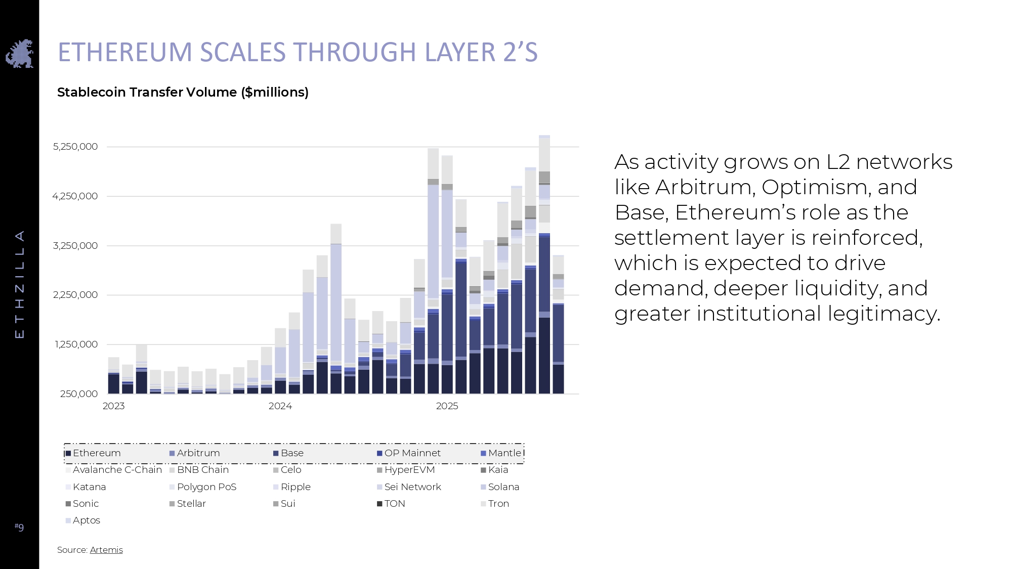 # 9 ETHEREUM SCALES THROUGH LAYER 2’S Source: Artemis As activity grows on L2 networks like Arbitrum, Optimism, and Base, Ethereum’s role as the settlement layer is reinforced, which is expected to drive demand, deeper liquidity, and greater institutional legitimacy. Stablecoin Transfer Volume ($millions) 250,000 1,250,000 2,250,000 3,250,000 4,250,000 5,250,000 2023 2024 2025 Ethereum Arbitrum Base OP Mainnet Mantle BNB Chain Polygon PoS Stellar Celo Ripple Sui HyperEVM Sei Network TON Kaia Solana Tron Avalanche C - Chain Katana Sonic Aptos
