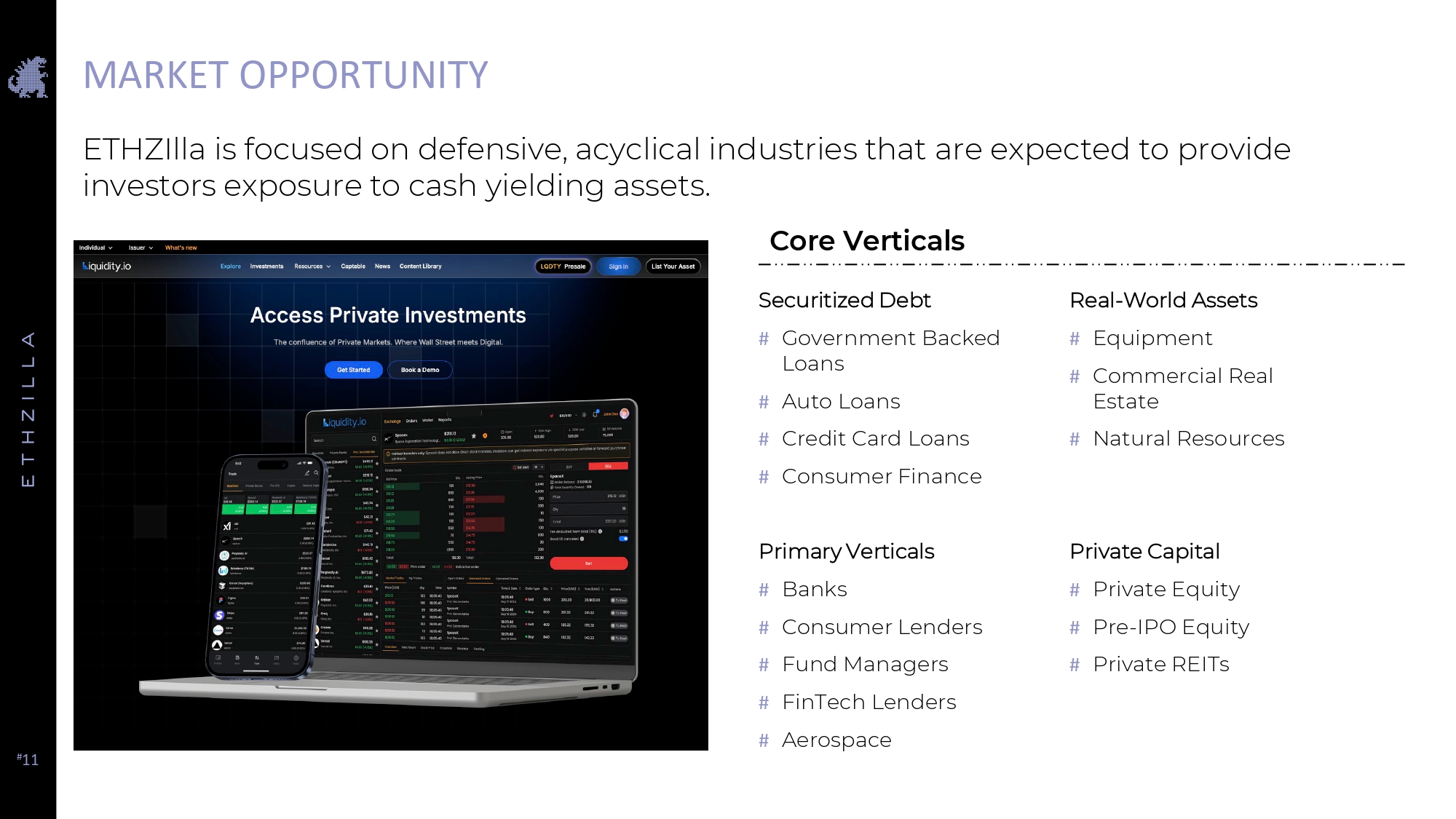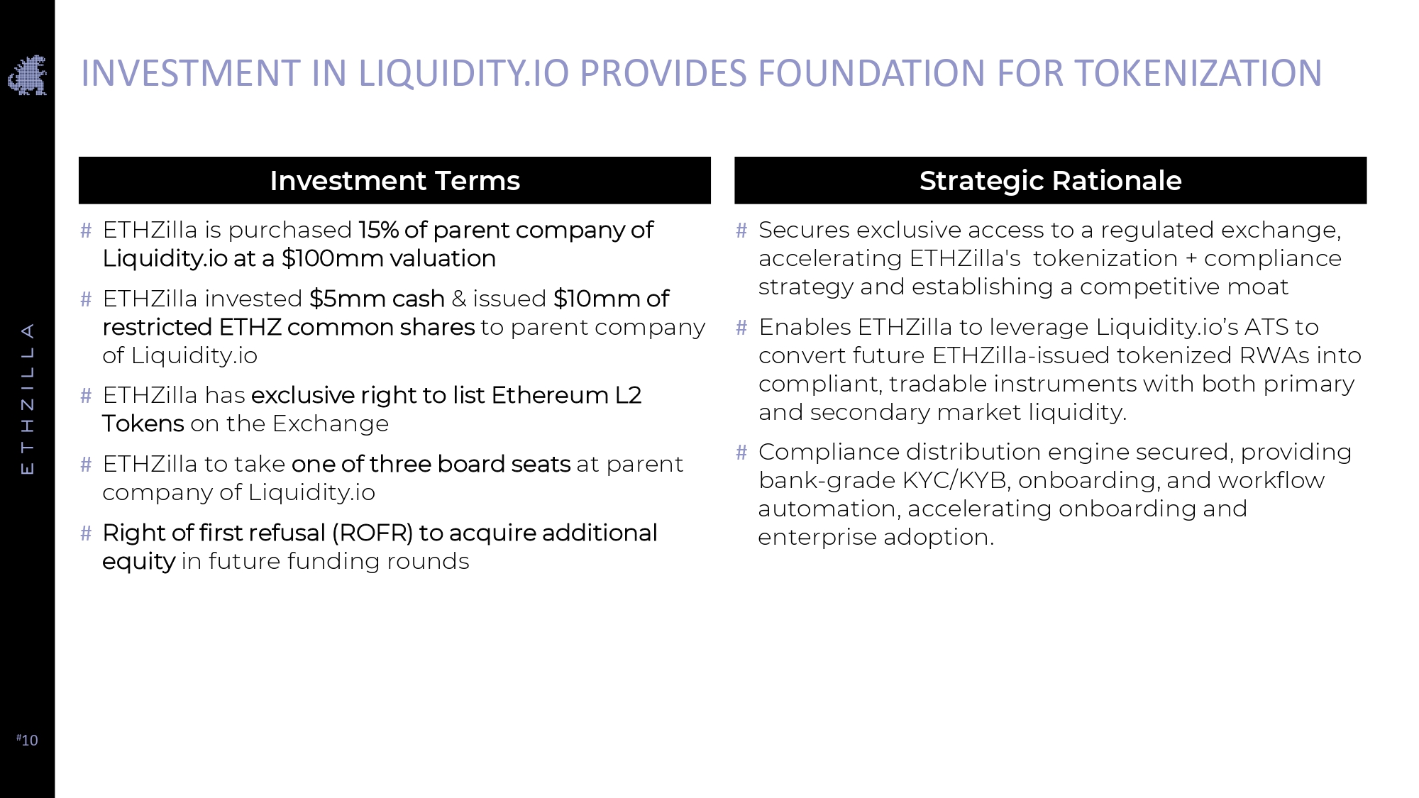# 10 INVESTMENT IN LIQUIDITY.IO PROVIDES FOUNDATION FOR TOKENIZATION # ETHZilla is purchased 15% of parent company of Liquidity.io at a $100mm valuation # ETHZilla invested $5mm cash & issued $10mm of restricted ETHZ common shares to parent company of Liquidity.io # ETHZilla has exclusive right to list Ethereum L2 Tokens on the Exchange # ETHZilla to take one of three board seats at parent company of Liquidity.io # Right of first refusal (ROFR) to acquire additional equity in future funding rounds Investment Terms Strategic Rationale # Secures exclusive access to a regulated exchange, accelerating ETHZilla's tokenization + compliance strategy and establishing a competitive moat # Enables ETHZilla to leverage Liquidity.io’s ATS to convert future ETHZilla - issued tokenized RWAs into compliant, tradable instruments with both primary and secondary market liquidity. # Compliance distribution engine secured, providing bank - grade KYC/KYB, onboarding, and workflow automation, accelerating onboarding and enterprise adoption.