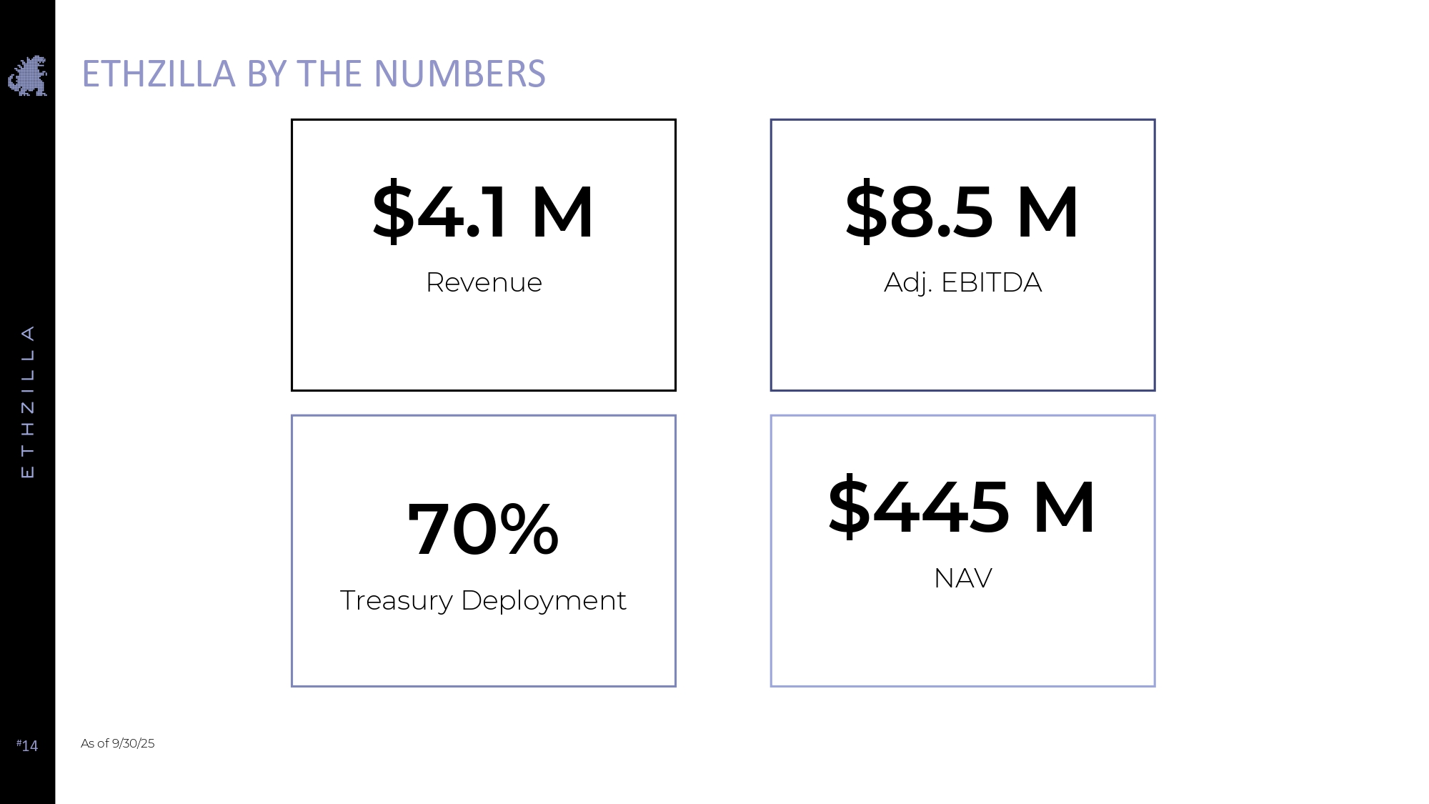 # 14 ETHZILLA BY THE NUMBERS As of 9/30/25 $4.1 M Revenue 70% Treasury Deployment $445 M NAV $8.5 M Adj. EBITDA