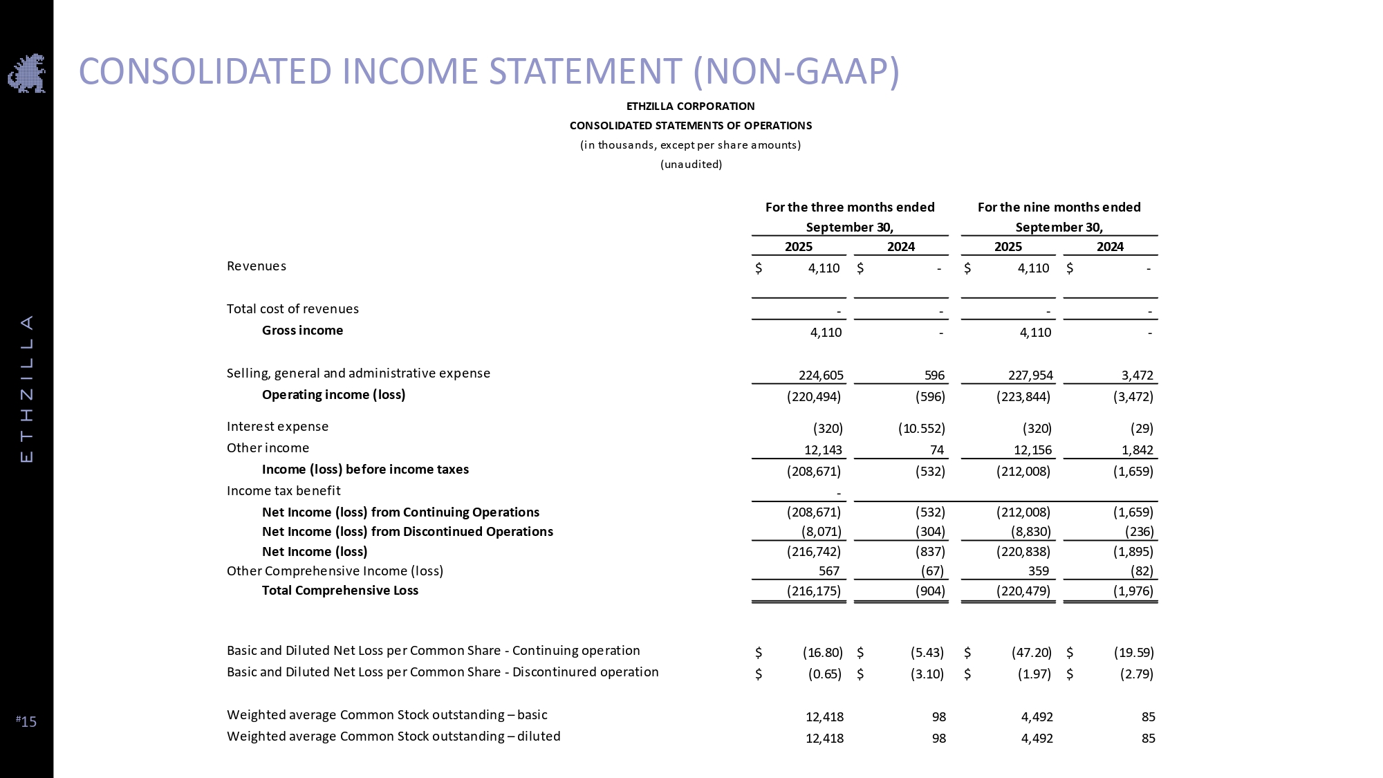 # 15 CONSOLIDATED INCOME STATEMENT (NON - GAAP) September 30, September 30, 2024 2025 2024 2025 $ - $ 4,110 $ - $ 4,110 Revenues - - - 4,110 - - - 4,110 Total cost of revenues Gross income 3,472 227,954 596 224,605 Selling, general and administrative expense (3,472) (223,844) (596) (220,494) Operating income (loss) (29) (320) (10.552) (320) Interest expense 1,842 12,156 74 12,143 Other income (1,659) (212,008) (532) (208,671) Income (loss) before income taxes Income tax benefit - (1,659) (212,008) (532) (208,671) Net Income (loss) from Continuing Operations (236) (8,830) (304) (8,071) Net Income (loss) from Discontinued Operations (1,895) (220,838) (837) (216,742) Net Income (loss) (82) 359 (67) 567 Other Comprehensive Income (loss) (1,976) (220,479) (904) (216,175) Total Comprehensive Loss $ (19.59) $ (47.20) $ (5.43) $ (16.80) Basic and Diluted Net Loss per Common Share - Continuing operation $ (2.79) $ (1.97) $ (3.10) $ (0.65) Basic and Diluted Net Loss per Common Share - Discontinured operation 85 4,492 98 12,418 Weighted average Common Stock outstanding – basic 85 4,492 98 12,418 Weighted average Common Stock outstanding – diluted For the nine months ended ETHZILLA CORPORATION CONSOLIDATED STATEMENTS OF OPERATIONS (in thousands, except per share amounts) (unaudited) For the three months ended