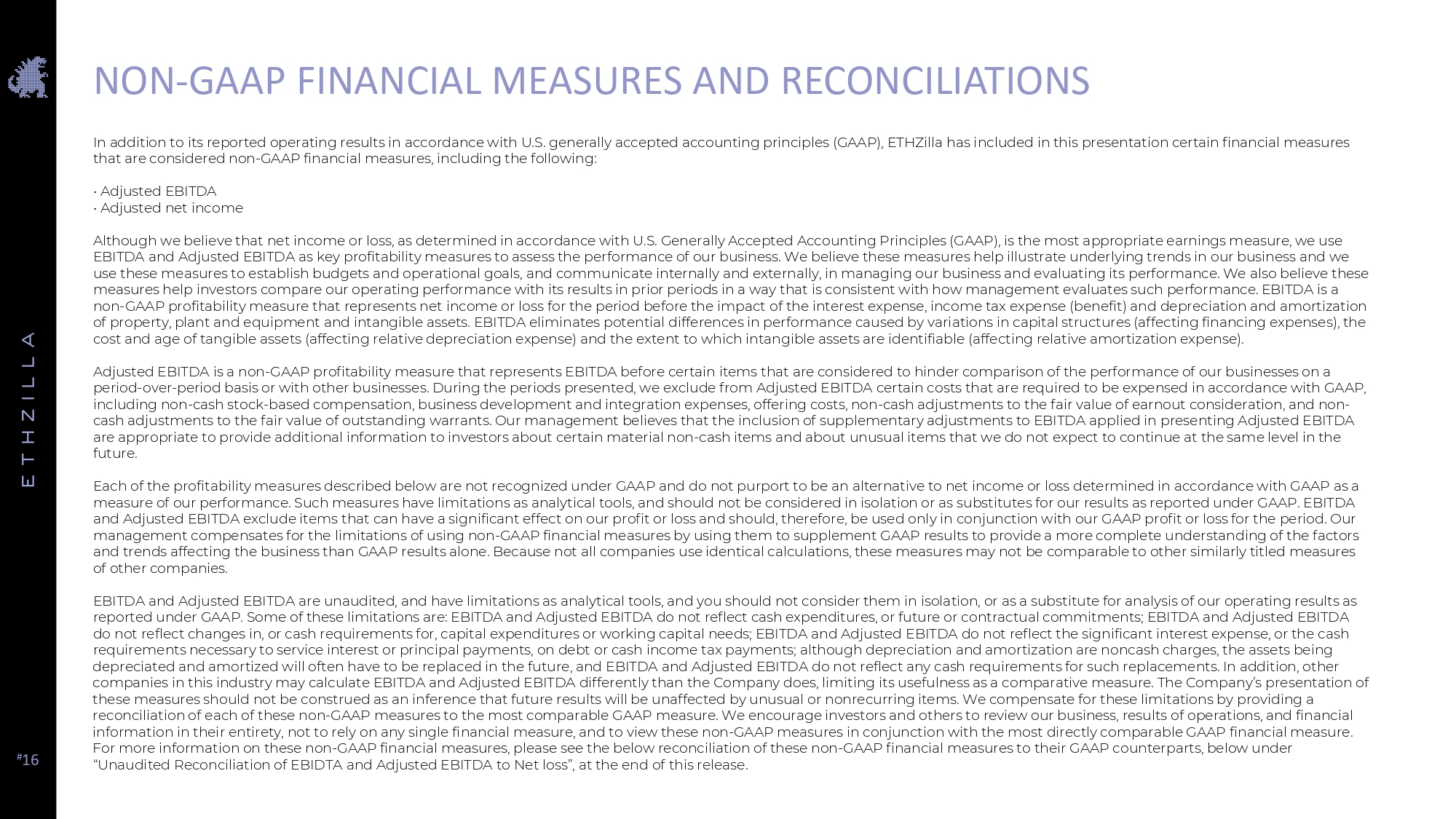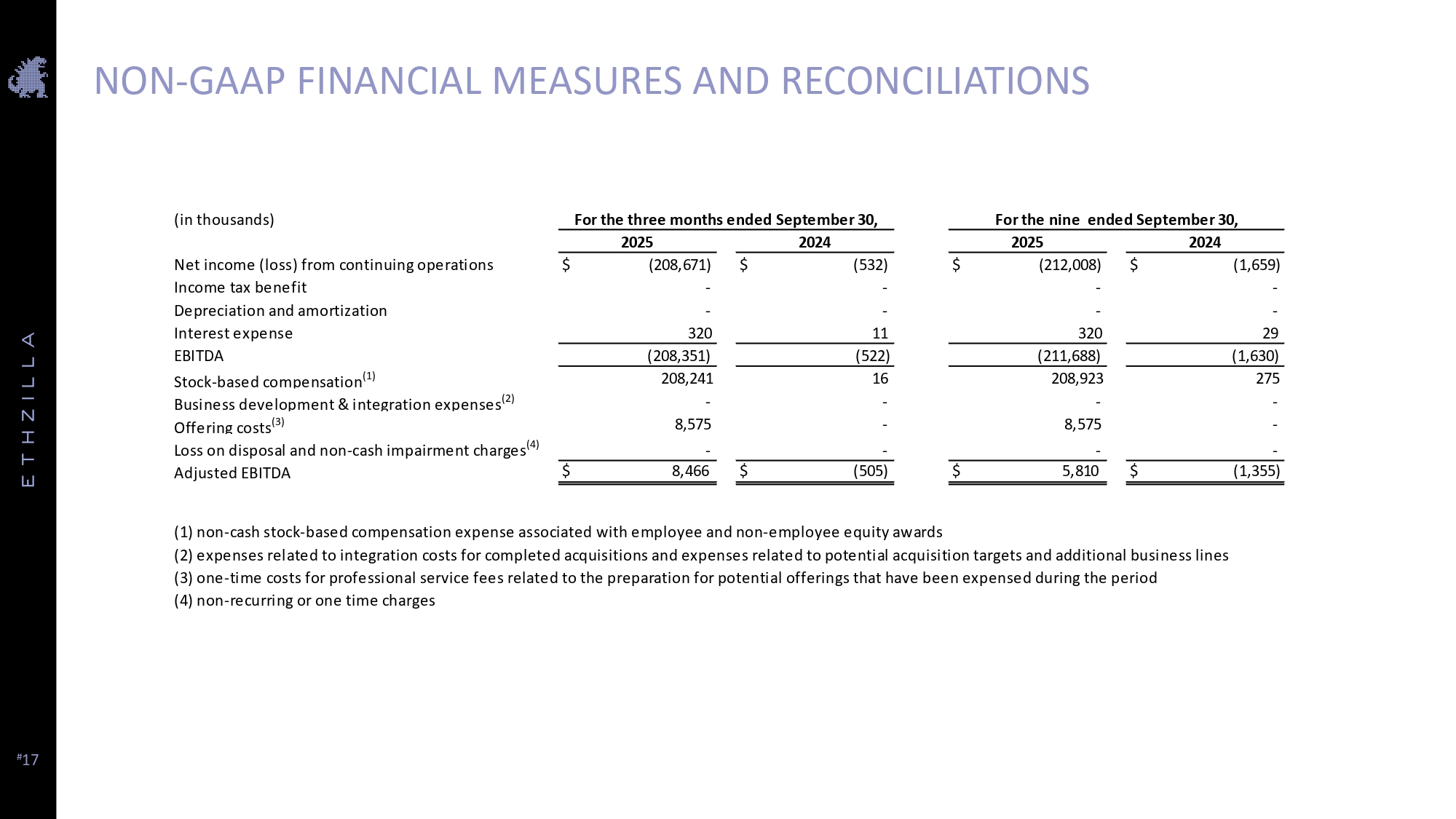 # 16 In addition to its reported operating results in accordance with U.S. generally accepted accounting principles (GAAP), ETHZilla has included in this presentation certain financial measures that are considered non - GAAP financial measures, including the following: • Adjusted EBITDA • Adjusted net income Although we believe that net income or loss, as determined in accordance with U.S. Generally Accepted Accounting Principles (GAAP), is the most appropriate earnings measure, we use EBITDA and Adjusted EBITDA as key profitability measures to assess the performance of our business. We believe these measures help illustrate underlying trends in our business and we use these measures to establish budgets and operational goals, and communicate internally and externally, in managing our business and evaluating its performance. We also believe these measures help investors compare our operating performance with its results in prior periods in a way that is consistent with how management evaluates such performance. EBITDA is a non - GAAP profitability measure that represents net income or loss for the period before the impact of the interest expense, income tax expense (benefit) and depreciation and amortization of property, plant and equipment and intangible assets . EBITDA eliminates potential differences in performance caused by variations in capital structures (affecting financing expenses), the cost and age of tangible assets (affecting relative depreciation expense) and the extent to which intangible assets are identifiable (affecting relative amortization expense) . Adjusted EBITDA is a non - GAAP profitability measure that represents EBITDA before certain items that are considered to hinder comparison of the performance of our businesses on a period - over - period basis or with other businesses. During the periods presented, we exclude from Adjusted EBITDA certain costs that are required to be expensed in accordance with GAAP, including non - cash stock - based compensation, business development and integration expenses, offering costs, non - cash adjustments to the fair value of earnout consideration, and non - cash adjustments to the fair value of outstanding warrants. Our management believes that the inclusion of supplementary adjustments to EBITDA applied in presenting Adjusted EBITDA are appropriate to provide additional information to investors about certain material non - cash items and about unusual items that we do not expect to continue at the same level in the future. Each of the profitability measures described below are not recognized under GAAP and do not purport to be an alternative to net income or loss determined in accordance with GAAP as a measure of our performance. Such measures have limitations as analytical tools, and should not be considered in isolation or as substitutes for our results as reported under GAAP. EBITDA and Adjusted EBITDA exclude items that can have a significant effect on our profit or loss and should, therefore, be used only in conjunction with our GAAP profit or loss for the period. Our management compensates for the limitations of using non - GAAP financial measures by using them to supplement GAAP results to provide a more complete understanding of the factors and trends affecting the business than GAAP results alone. Because not all companies use identical calculations, these measures may not be comparable to other similarly titled measures of other companies. EBITDA and Adjusted EBITDA are unaudited, and have limitations as analytical tools, and you should not consider them in isolation, or as a substitute for analysis of our operating results as reported under GAAP. Some of these limitations are: EBITDA and Adjusted EBITDA do not reflect cash expenditures, or future or contractual commitments; EBITDA and Adjusted EBITDA do not reflect changes in, or cash requirements for, capital expenditures or working capital needs; EBITDA and Adjusted EBITDA do not reflect the significant interest expense, or the cash requirements necessary to service interest or principal payments, on debt or cash income tax payments; although depreciation and amortization are noncash charges, the assets being depreciated and amortized will often have to be replaced in the future, and EBITDA and Adjusted EBITDA do not reflect any cash requirements for such replacements. In addition, other companies in this industry may calculate EBITDA and Adjusted EBITDA differently than the Company does, limiting its usefulness as a comparative measure. The Company’s presentation of these measures should not be construed as an inference that future results will be unaffected by unusual or nonrecurring items. We compensate for these limitations by providing a reconciliation of each of these non - GAAP measures to the most comparable GAAP measure. We encourage investors and others to review our business, results of operations, and financial information in their entirety, not to rely on any single financial measure, and to view these non - GAAP measures in conjunction with the most directly comparable GAAP financial measure. For more information on these non - GAAP financial measures, please see the below reconciliation of these non - GAAP financial measures to their GAAP counterparts, below under “Unaudited Reconciliation of EBIDTA and Adjusted EBITDA to Net loss”, at the end of this release. NON - GAAP FINANCIAL MEASURES AND RECONCILIATIONS