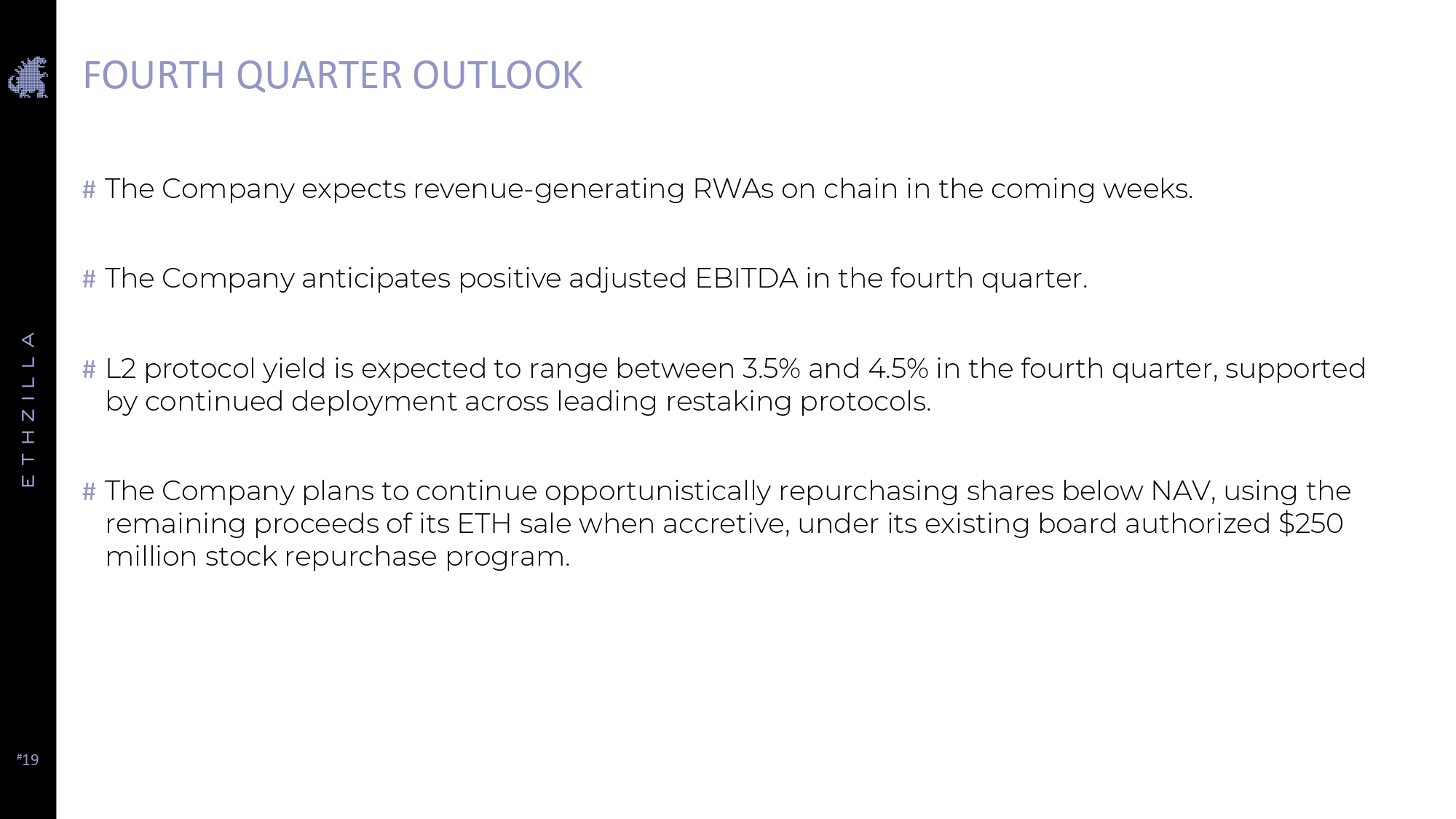 # 19 FOURTH QUARTER OUTLOOK # The Company expects revenue - generating RWAs on chain in the coming weeks. # The Company anticipates positive adjusted EBITDA in the fourth quarter. # L 2 protocol yield is expected to range between 3 . 5 % and 4 . 5 % in the fourth quarter, supported by continued deployment across leading restaking protocols . # The Company plans to continue opportunistically repurchasing shares below NAV, using the remaining proceeds of its ETH sale when accretive, under its existing board authorized $ 250 million stock repurchase program .