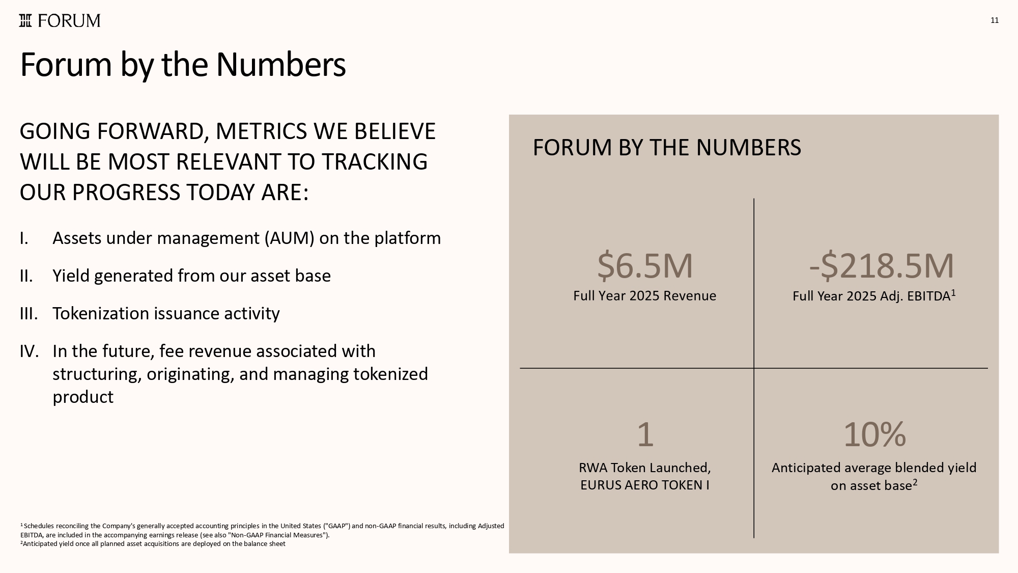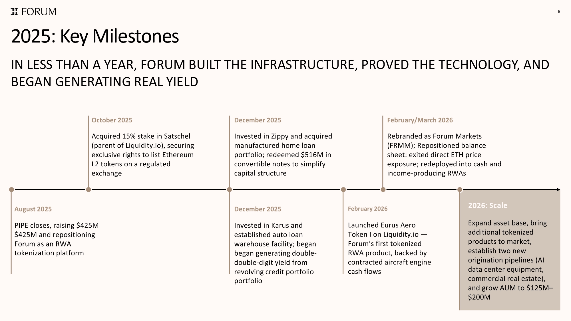 8 2025: Key Milestones 2026: Scale IN LESS THAN A YEAR, FORUM BUILT THE INFRASTRUCTURE, PROVED THE TECHNOLOGY, AND BEGAN GENERATING REAL YIELD