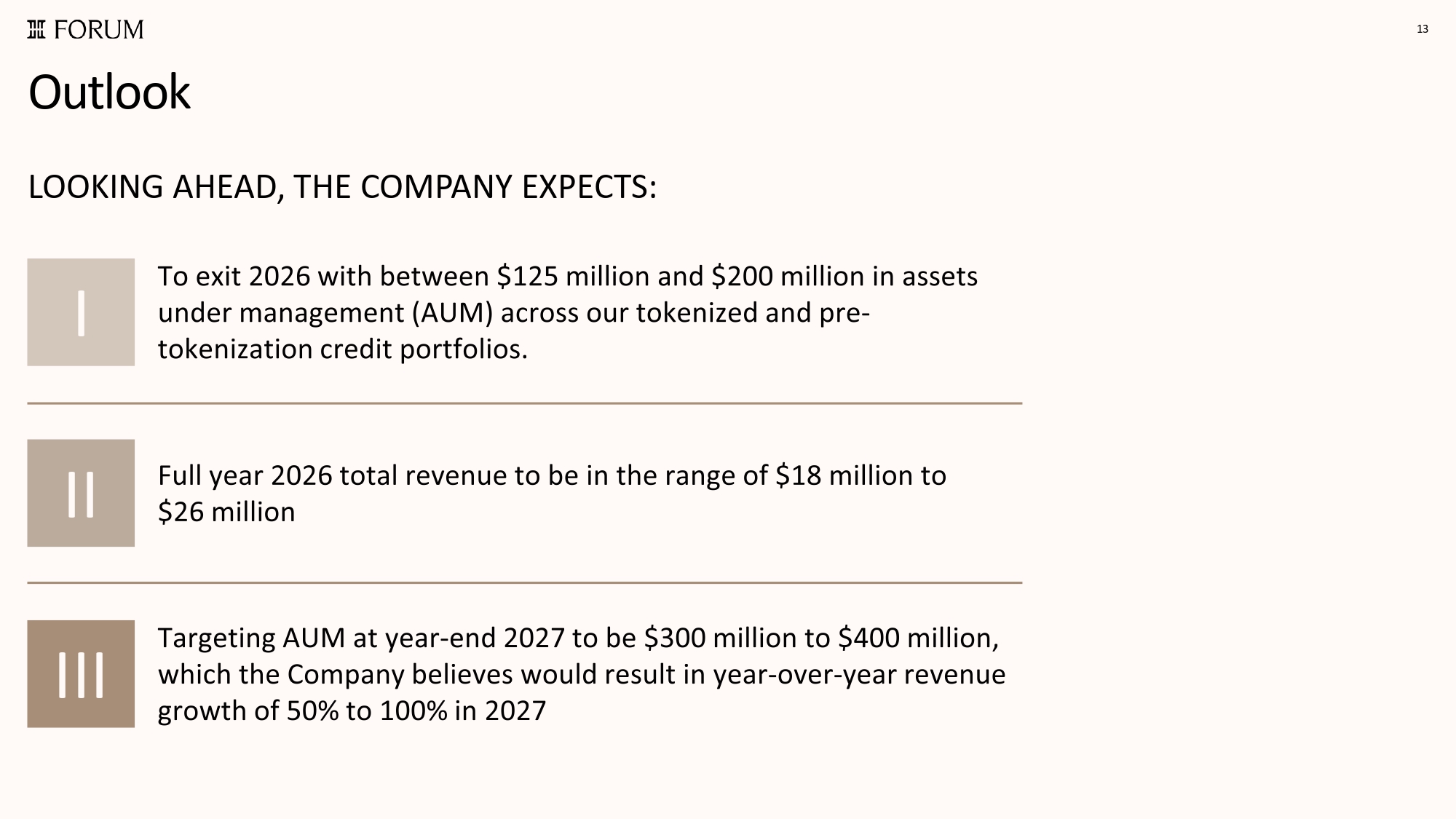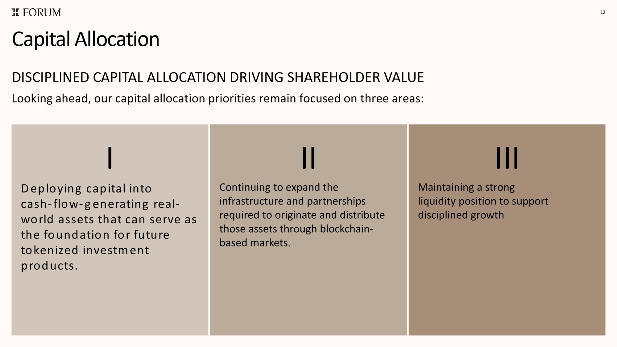 11 Forum by the Numbers I. Assets under management (AUM) on the platform II. Yield generated from our asset base III. Tokenization issuance activity IV. In the future, fee revenue associated with structuring, originating, and managing tokenized product GOING FORWARD, METRICS WE BELIEVE WILL BE MOST RELEVANT TO TRACKING OUR PROGRESS TODAY ARE: 1 Schedules reconciling the Company's generally accepted accounting principles in the United States ("GAAP") and non - GAAP financia l results, including Adjusted EBITDA, are included in the accompanying earnings release (see also "Non - GAAP Financial Measures"). 2 Anticipated yield once all planned asset acquisitions are deployed on the balance sheet RWA Token Launched, EURUS AERO TOKEN I Anticipated average blended yield on asset base 2 Full Year 2025 Adj. EBITDA 1 $6.5M - $218.5M 1 10% FORUM BY THE NUMBERS
