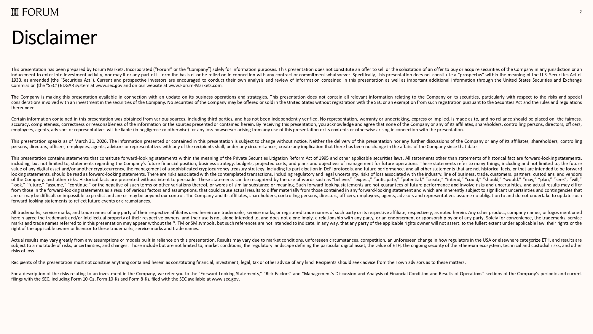2 Disclaimer This presentation has been prepared by Forum Markets, Incorporated (“Forum” or the “Company”) solely for information purposes . This presentation does not constitute an offer to sell or the solicitation of an offer to buy or acquire securities of the Company in any jurisdiction or an inducement to enter into investment activity, nor may it or any part of it form the basis of or be relied on in connection with any contract or commitment whatsoever . Specifically, this presentation does not constitute a “prospectus” within the meaning of the U . S . Securities Act of 1933 , as amended (the “Securities Act”) . Current and prospective investors are encouraged to conduct their own analysis and review of information contained in this presentation as well as important additional information through the United States Securities and Exchange Commission (the “SEC”) EDGAR system at www . sec . gov and on our website at www . Forum - Markets . com . The Company is making this presentation available in connection with an update on its business operations and strategies . This presentation does not contain all relevant information relating to the Company or its securities, particularly with respect to the risks and special considerations involved with an investment in the securities of the Company . No securities of the Company may be offered or sold in the United States without registration with the SEC or an exemption from such registration pursuant to the Securities Act and the rules and regulations thereunder . Certain information contained in this presentation was obtained from various sources, including third parties, and has not been independently verified . No representation, warranty or undertaking, express or implied, is made as to, and no reliance should be placed on, the fairness, accuracy, completeness, correctness or reasonableness of the information or the sources presented or contained herein . By receiving this presentation, you acknowledge and agree that none of the Company or any of its affiliates, shareholders, controlling persons, directors, officers, employees, agents, advisors or representatives will be liable (in negligence or otherwise) for any loss howsoever arising from any use of this presentation or its contents or otherwise arising in connection with the presentation . This presentation speaks as of March 31 , 2026 . The information presented or contained in this presentation is subject to change without notice . Neither the delivery of this presentation nor any further discussions of the Company or any of its affiliates, shareholders, controlling persons, directors, officers, employees, agents, advisors or representatives with any of the recipients shall, under any circumstances, create any implication that there has been no change in the affairs of the Company since that date . This presentation contains statements that constitute forward - looking statements within the meaning of the Private Securities Litigation Reform Act of 1995 and other applicable securities laws . All statements other than statements of historical fact are forward - looking statements, including, but not limited to, statements regarding the Company's future financial position, business strategy, budgets, projected costs, and plans and objectives of management for future operations . These statements refer to many things, including and not limited to, the future value of any digital asset and/or another cryptocurrency, the management of a sophisticated cryptocurrency treasury strategy, including its participation in DeFi protocols, and future performance, and all other statements that are not historical facts, or that are intended to be forward looking statements, should be read as forward - looking statements . There are risks associated with the contemplated transactions, including regulatory and legal uncertainty, risks of loss associated with the industry, line of business, trade, customers, partners, custodians, and vendors of the Company, and other risks . Historical facts are presented without intent to persuade . These statements can be recognized by the use of words such as “believe,” “expect,” “anticipate,” “potential,” “create,” “intend,” “could,” “should,” “would,” “may,” “plan,” “seek”, “will,” “look,” “future,” “assume,” “continue,” or the negative of such terms or other variations thereof, or words of similar substance or meaning . Such forward - looking statements are not guarantees of future performance and involve risks and uncertainties, and actual results may differ from those in the forward - looking statements as a result of various factors and assumptions, that could cause actual results to differ materially from those contained in any forward - looking statement and which are inherently subject to significant uncertainties and contingencies that are or may be difficult or impossible to predict and are or may be beyond our control . The Company and its affiliates, shareholders, controlling persons, directors, officers, employees, agents, advisors and representatives assume no obligation to and do not undertake to update such forward - looking statements to reflect future events or circumstances . All trademarks, service marks, and trade names of any party of their respective affiliates used herein are trademarks, service marks, or registered trade names of such party or its respective affiliate, respectively, as noted herein . Any other product, company names, or logos mentioned herein agree the trademark and/or intellectual property of their respective owners, and their use is not alone intended to, and does not alone imply, a relationship with any party, or an endorsement or sponsorship by or of any party . Solely for convenience, the trademarks, service marks and trade names referred to in this presentation may appear without the ®, TM or SM symbols, but such references a