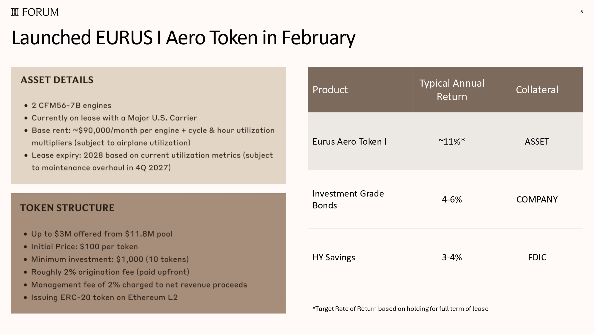 6 Launched EURUS I Aero Token in February Collateral Typical Annual Return Product ASSET ~11%* Eurus Aero Token I COMPANY 4 - 6% Investment Grade Bonds FDIC 3 - 4% HY Savings *Target Rate of Return based on holding for full term of lease