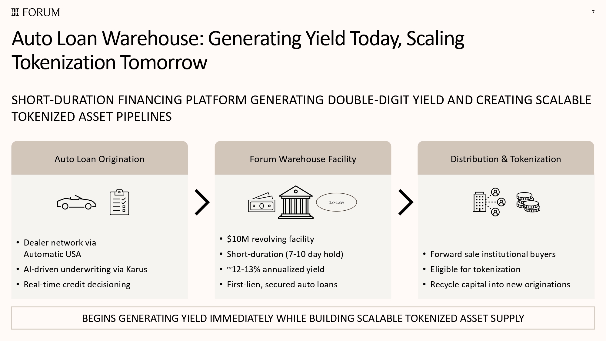 7 Auto Loan Warehouse: Generating Yield Today, Scaling Tokenization Tomorrow SHORT - DURATION FINANCING PLATFORM GENERATING DOUBLE - DIGIT YIELD AND CREATING SCALABLE TOKENIZED ASSET PIPELINES • $10M revolving facility • Short - duration (7 - 10 day hold) • ~12 - 13% annualized yield • First - lien, secured auto loans • Forward sale institutional buyers • Eligible for tokenization • Recycle capital into new originations • Dealer network via Automatic USA • AI - driven underwriting via Karus • Real - time credit decisioning Auto Loan Origination Forum Warehouse Facility Distribution & Tokenization 12 - 13% BEGINS GENERATING YIELD IMMEDIATELY WHILE BUILDING SCALABLE TOKENIZED ASSET SUPPLY