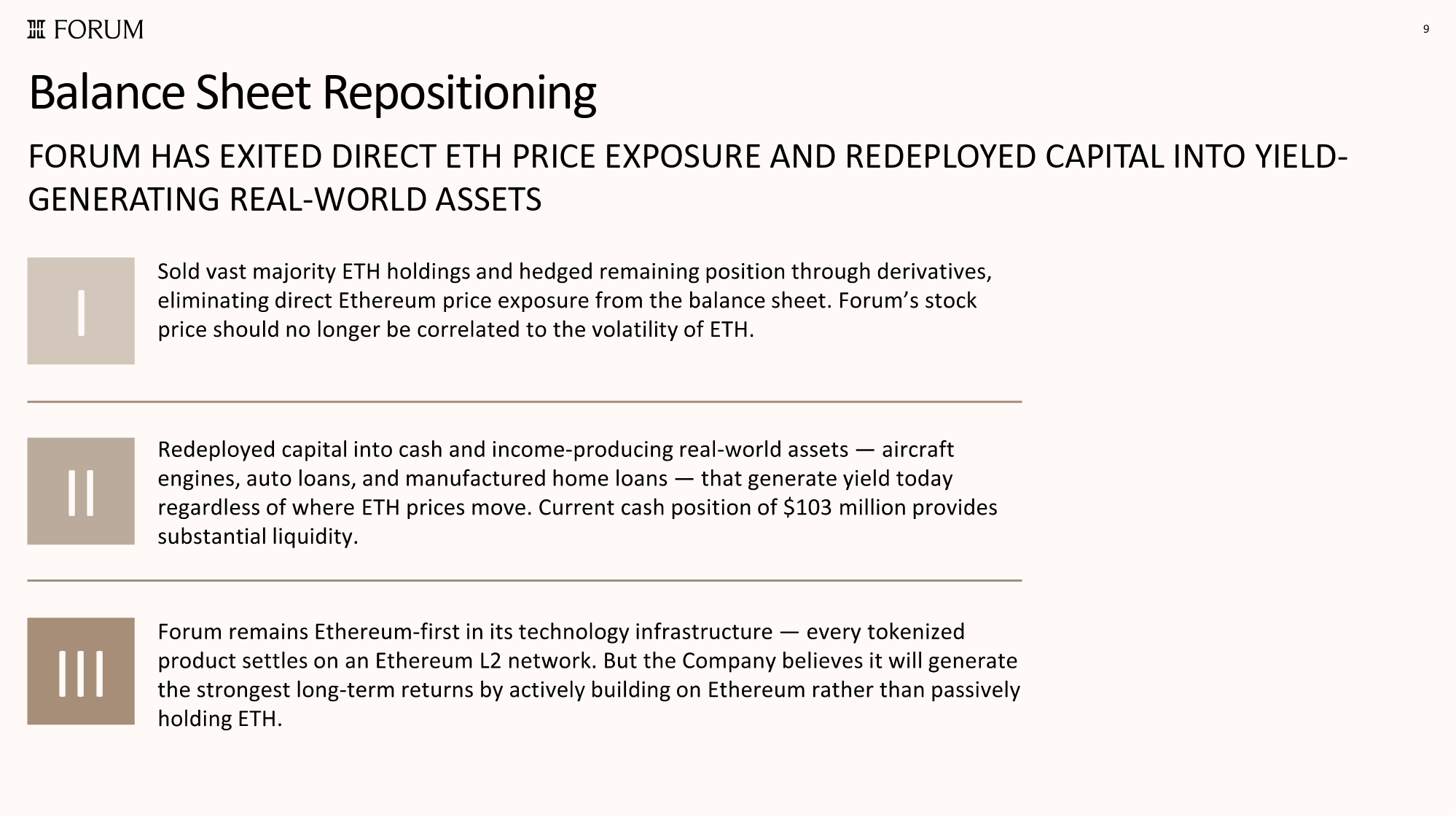 9 Balance Sheet Repositioning FORUM HAS EXITED DIRECT ETH PRICE EXPOSURE AND REDEPLOYED CAPITAL INTO YIELD - GENERATING REAL - WORLD ASSETS I II III
